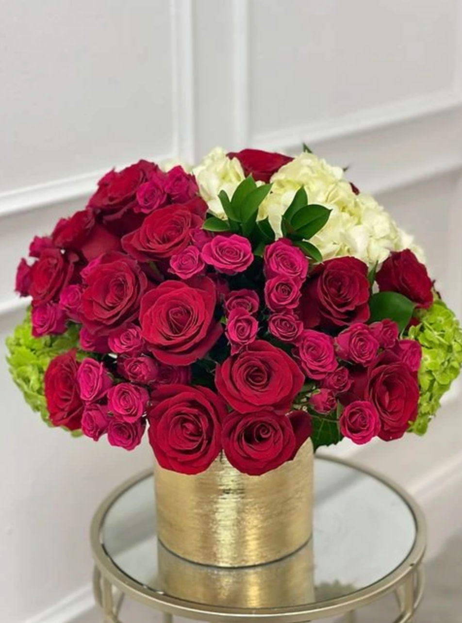Red roses, pink spray roses, white and green hydraneas in a gold ceramic vase.